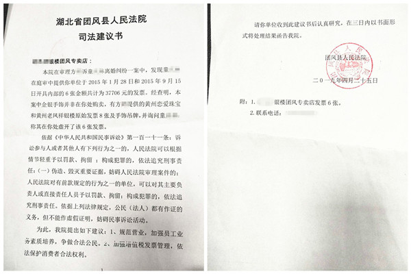 银楼收到司法建议书后,立即整改并书面回复整改意见:1、扣除当事人童某当月全部奖金。2、责令童某查阅法律知识,要求与同事分享学习。3、强化员工法律意识,维护消费者合法权益,强化票据管理,避免出现类似事情。4、举一反三,加强开具不实票据处罚力度。童某个人也认识到自己的违法行为,向法院出具书面悔过书。