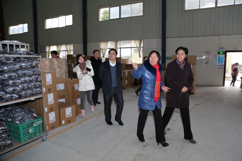 图二 李静实地察看百丈河村鞋面加工厂2.