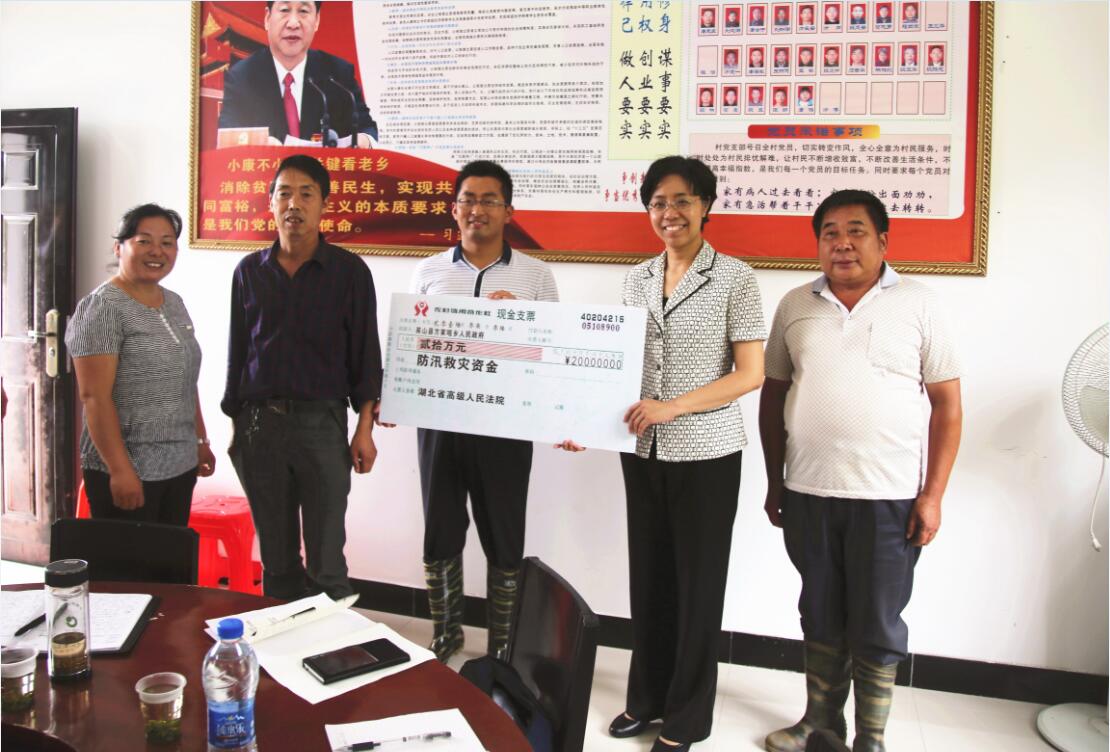 (黄美泽、王林浩)7月6日,省高院党组书记、院长李静带领党组副书记、副院长覃文萍和党组成员、副院长田昌兵,党组成员、政治部主任程宝清等一行,冒雨深入精准扶贫、“三万”活动联系点村英山县方家咀乡葫芦盆村、大畈河村,检查指导防汛救灾工作,代表省高院捐赠防汛救灾资金20万元。黄冈市委常委陈继平,黄冈中院党组书记、院长贾石松和英山县委书记陈武斌等陪同检查。贾石松代表黄冈中院向受灾群众捐赠了防汛救灾资金。 李静一行实地察看了大畈河受损河堤加固修复工程,深入群众被淹房屋了解当地受灾情况。随后,为更加深入了解灾情,李静不顾满路积水和泥泞,从大畈河村一路徒步前往葫芦盆村。途中,每看到水毁农田、河堤、道路和塌方滑坡等受灾处,她都要驻足察看,并向镇村干部详细询问了解损失情况和修复措施。她强调,要始终将群众的生命财产安全放在首位,将各项防汛措施严格落实到位,最大限度降低损失、帮助受灾群众恢复生产生活。对房屋毁于泥石流的胡安保和被转移安置的毛心意等群众,李静亲手送上了慰问金,并勉励她们要坚定信心、克服困难,积极重建家园。 在葫芦盆村,李静现场察看了由省高院援建的精准扶贫光伏发电项目,了解项目运行和收益情况。当得知该项目为英山县第一家投入使用的光伏发电设备,并已取得直接经济收益时,李静院长高兴地说,精准扶贫关键在于脱贫到户,要加快光伏发电二期工程建设,让村里更多老百姓受益,对于资金上的困难,省高院还可以再争取。 在葫芦盆村部召开的防汛救灾工作座谈会上,李静详细听取了县、乡负责人关于受灾救灾情况汇报。她指出,英山县受灾情况较为严重,但天灾无情人有情,特别是县里各级党员干部带头奋战抗洪救灾一线,工作卓有成效、措施有力效果好,充分展示了党员先锋形象,形成了巨大的精神力量。她强调,抗洪救灾是当前首要工作,要严格按照省委李鸿忠书记生命第一、生活第一的指示精神,进一步加强防汛防灾措施,做好迎大涝、防大洪准备,确保不出现人员伤亡,最大限度保护人民群众生命财产安全;要进一步强化救灾措施,迅速组织开展群众自救、安置转移和灾后重建工作;要进一步强化扶贫脱贫措施,巩固优化已到位的扶贫项目,加快推进在建项目。省高院党组将严格贯彻省委部署,怀着对老区人民的深厚感情,帮助群众打赢这场防汛救灾和精准脱贫战役。