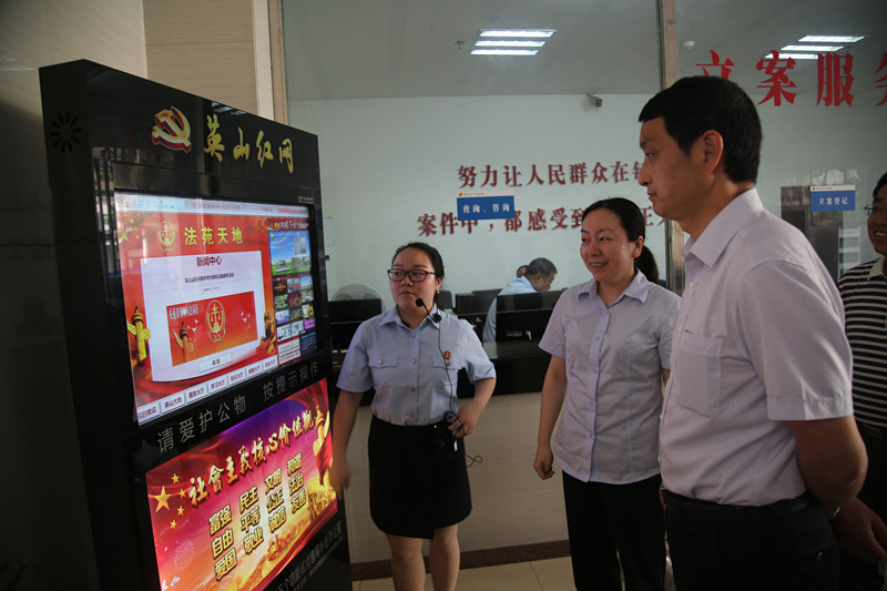 刘海军一行先后实地察看了我院“两学一做”工作掠影、诉讼服务中心、主题文化墙、党建活动室和荣誉室。随后,听取了院党组书记、院长程华关于我院“两学一做”学习教育工作的专题汇报。刘海军副书记对我院开展的“两学一做”学习教育工作给予了充分肯定。说本次来英山法院调研学习教育工作虽然时间很短,但是体会很深,法院的各项工作都呈现出全面进步、全面丰收的状态,这份成功来之不易、也实至名归。刘海军指出,英山法院“两学一做”学习教育工作开展得扎实有效,主要呈现五大特点:一是领导重视,认识高,主体责任意识性强;二是工作推进有力,落实到位;三是载体丰富、有声有色,学习教育工作深入人心;四是结合紧密,与法院审执工作、服务中心等都紧密融合;五是成效初显,各方面评价都很不错。