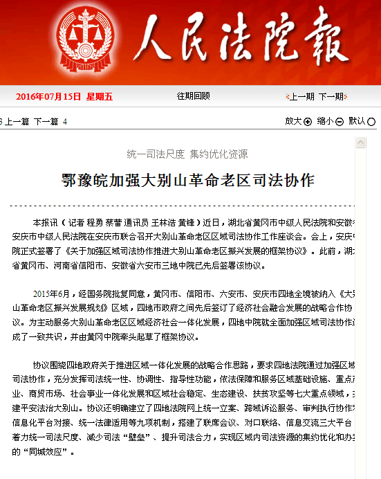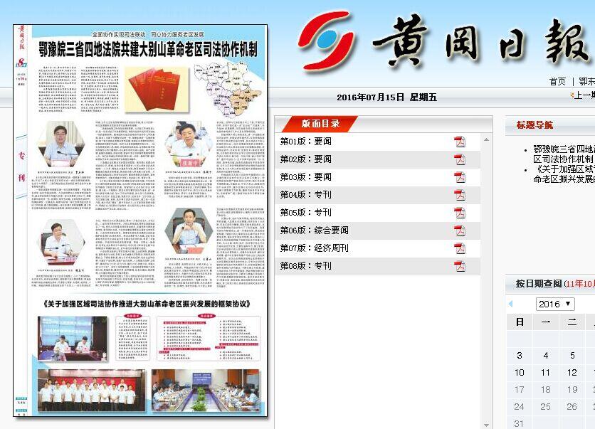 《人民法院报》、《黄冈日报》等多家媒体报道大别山革命老区区域司法协作机制