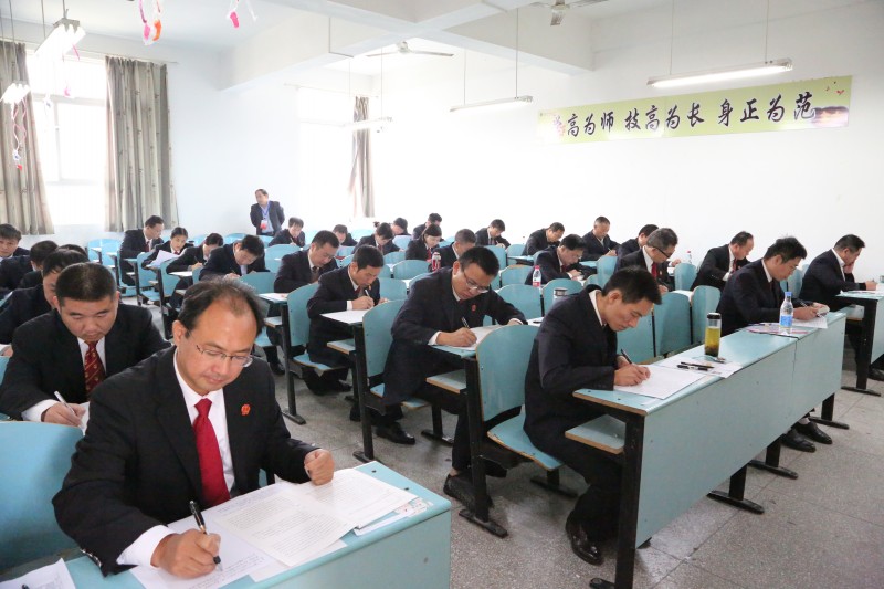 按照《湖北法院司法体制改革试点工作实施方案》要求,法官入额通过“考试+考核”程序进行遴选,考试考核实行百分制,考试占30%分值。为组织好此次考试,市中院专门成立了以院长为组长的全市法院法官入额考试工作领导小组,各法院在考前均召开了全体参考人员参加的专题会议进行动员部署,加强考试纪律教育。全市两级法院共有542名法官报名考试并通过资格审查,实有531名法官参加了考试,参考率达98%。具体考务工作由黄冈人事考试院统一组织实施,每个考场内均有全景视频监控并同步录音录像,确保考试公平公正进行。