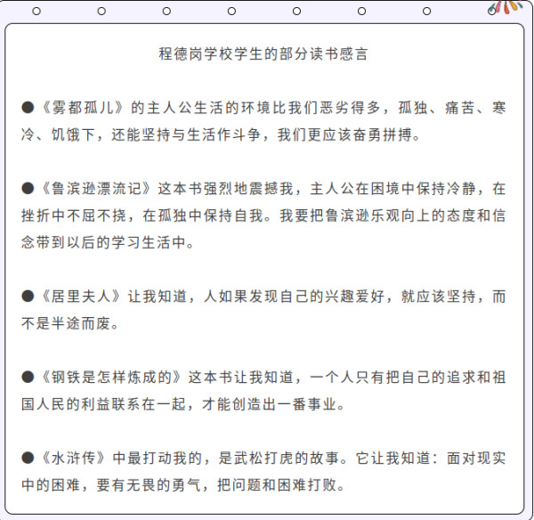 每一本书都伴随着一个故事,一段心路历程。法院干警们分享的书,是给孩子们的守护和希望。专门学校师生教官分享的书,是给孩子们的期待与关切。孩子们分享的书,是孩子们自己的心声和期盼。书籍与法律,这两束照亮世界的光,交汇于一处,共同照亮程德岗学生前行的路。