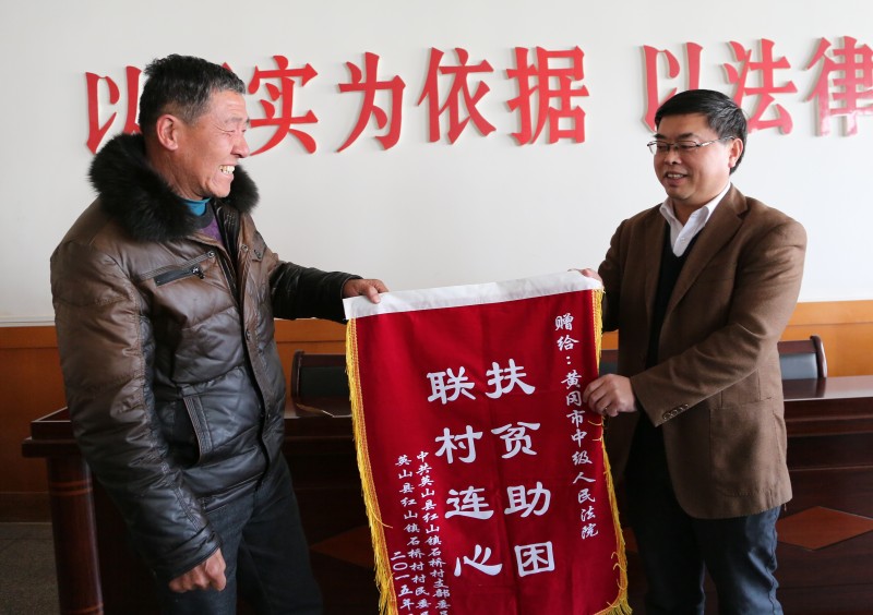 2月13日,英山县红山镇、石桥村两级负责人专程将一幅“扶贫助困、联村连心”的锦旗送到市中院,市中院党组书记、院长贾石松代表市中院接受了锦旗。