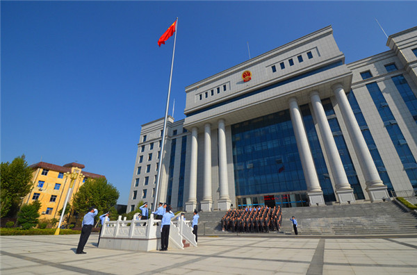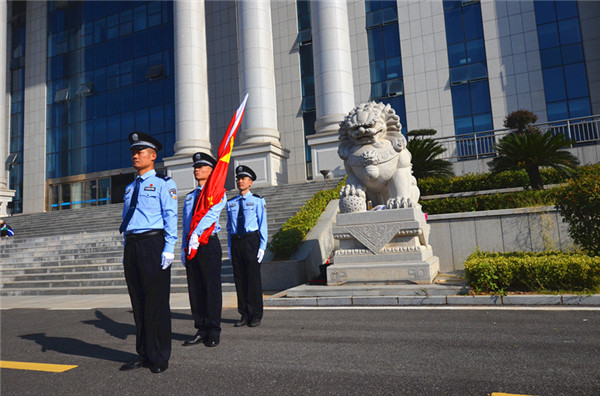 上午8时许,全体干警精神饱满地列队在法院审判综合大楼前,法警迈着整齐的步伐,守护国旗行至升旗台,在激昂的《义勇军进行曲》中,鲜艳的五星红旗冉冉升起,迎风飘扬,全体干警身着制服佩戴小法徽,庄严肃立行注目礼。