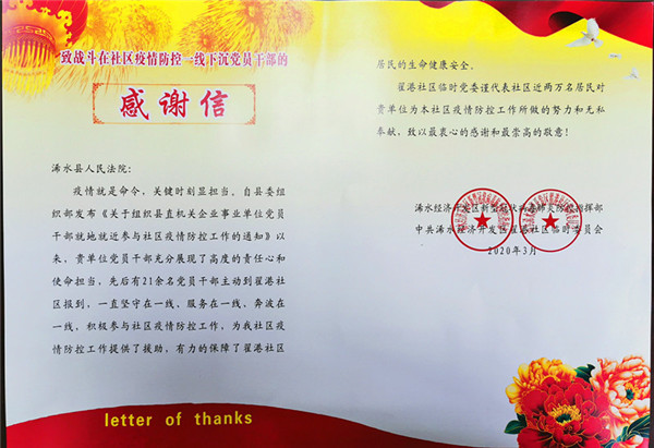 3月30日,浠水法院收到浠水经济开发区翟港社区送来的一份感谢信,感谢浠水法院干警在新冠肺炎疫情防控的关键时期挺身而出、冲锋在前,助力社区打好疫情防控阻击战。