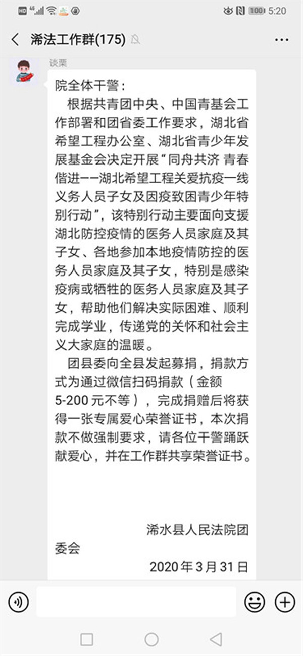 据悉,浠水法院团支部积极响应浠水县团委号召,为抗疫一线医务人员子女及因疫致困青少年募捐。截至今日,全院干警累计捐款三千余元,该款项将由湖北省青基会对符合条件的抗疫医务人员子女和因疫致困青少年进行补助和资助。
