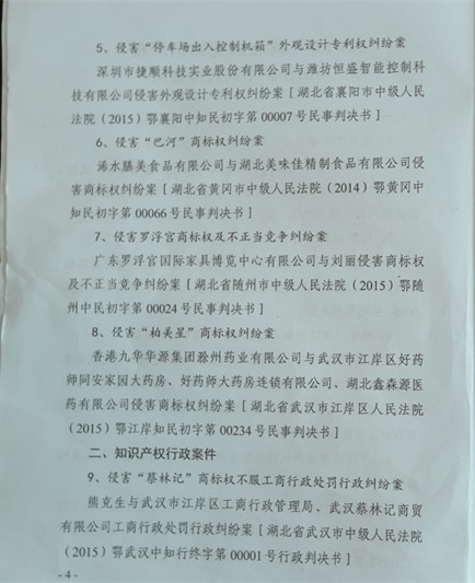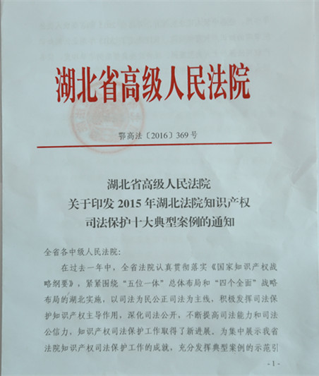 市中院民三庭知识产权案件入选2015年度湖北法院知识产权十大典型案例
