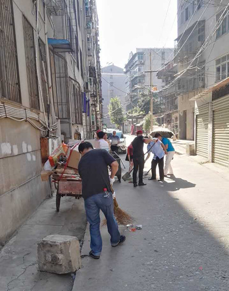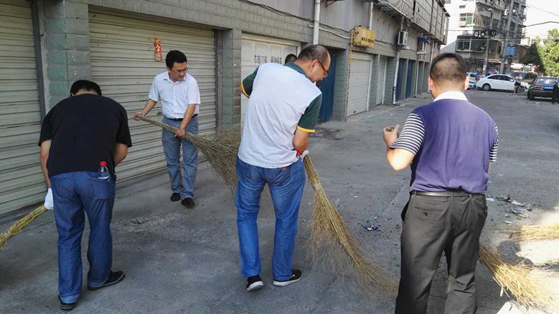9月2日,市中院党组成员周超良带领部分干警走进印染社区,积极参与创卫活动。大家带着扫帚、铁锹等工具不怕脏,不怕累,仔细清扫路面的垃圾,清除杂草,不留卫生死角,为我市创建国家卫生城市贡献力量。