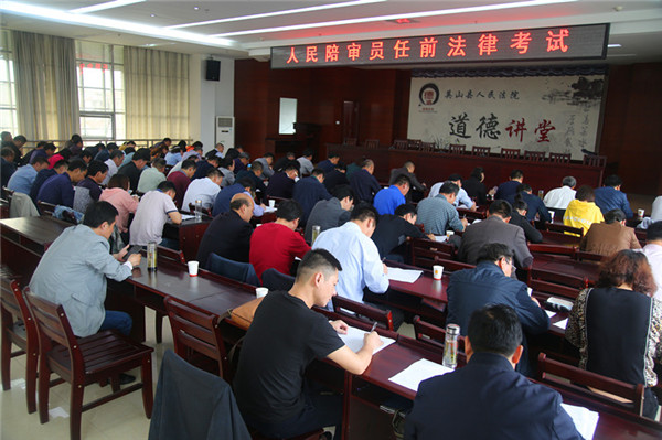 4月22日,英山法院按照县人大要求,组织85名新当选的人民陪审员进行任前法律知识考试。英山县人大、法院、司法局等单位领导到场监督指导考试。