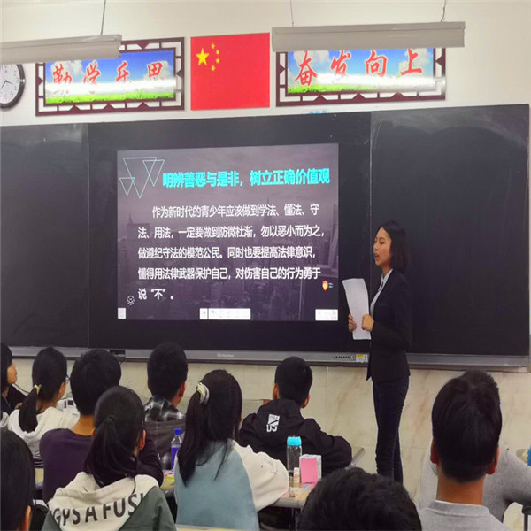 小池法庭青年法官助理郭静以“送法进校园,护航未成年人健康成长”为主题,结合《中华人民共和国未成年人保护法》《中华人民共和国预防未成年人犯罪法》法律法规及实际案例,通过PTT图片展示、动画播放等形式为学生们生动讲解了送法进校园的重要意义、未成年人犯罪的严峻形势、未成年人容易受到侵害的原因及如何有效预防未成年人犯罪等内容。并引导在校学生要遵纪守法,谨慎交友,增强辨别是非的能力;提升自我保护的能力,在自身合法权益受到侵害时要及时寻求家庭、学校、社会以及司法的保护,远离违法犯罪行为的侵害。课堂上,学生们踊跃发言,积极互动,气氛热烈。